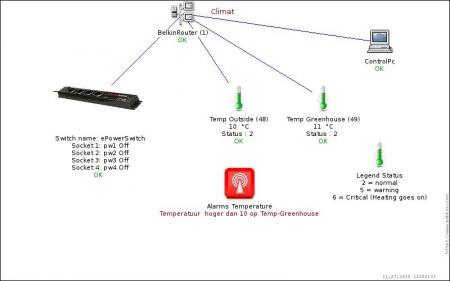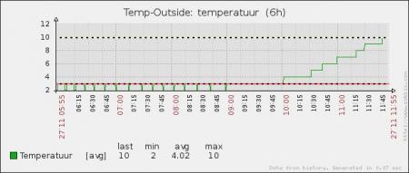 Hieronder kan je zien dat ik een trigger plaatste op 10 graden, dan krijg ik een melding temperatuur hoog. Ik krijg een melding als de temperatuur 3 graden is 'warning' Ik krijg een melding als de temperatuur 2 graden is 'critical' Bij critical gaat een relais aan die het kacheltje start. Bij hoger temperaturen hoger dan critical slaat de relais weer uit.