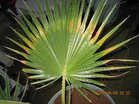 Mijn Washingtonia filifera verliest steeds meer blad. Er komt weliswaar een nieuw blad in, echter het verliest ook steeds blad voor blad...De bladeren waren begin dit jaar nog allemaal egaal groen. Maar steeds moet ik een blad wegnemen omdat het uiteindelijk geel wordt. Het process begint op het midden van het blad ( zie foto ) Dit vergelen verspreidt zich vervolgens over het blad uit totdat het in z'n geheel geel en verdord is en verwijderd moet worden. Mijn palm heeft nu nog slechts 2 bladeren over...van de 5.