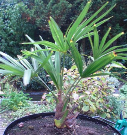 een trachycarpus fortunei hij kan tot -18gr maar ik zou hem deze winter nog binnen zetten en in het voorjaar in de volle grond zetten