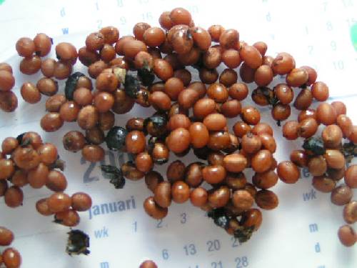 De zaden waren klein en rond, zaten aan een grote tros en waren licht bruin van kleur. De stam van de boom was vrij glad.