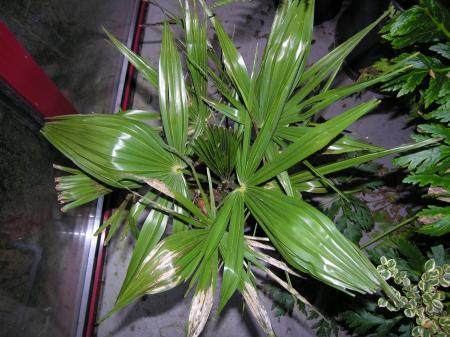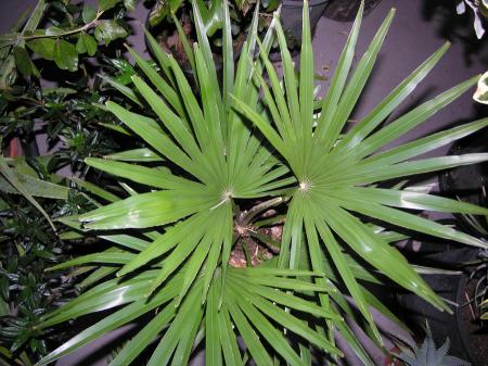 Tenslotte het buitenbeentje nr 5, het lelijke eendje van dit palmenquintet. Deze werd me ooit aangeleverd als Trachycarpus 'takeshi', maar die naam heb ik tot nu toe niet kunnen verifiëren. Kenmerkend zijn de qua breedte ongelijkmatige bladslippen, waardoor de palm een beetje aan de soort geminisectus doet denken.