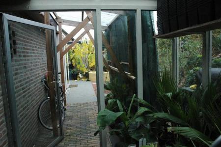 Een uitkijkje vanuit de kas, de lengte van het afdak is ongeveer 5 meter en 2.20m1 breed.