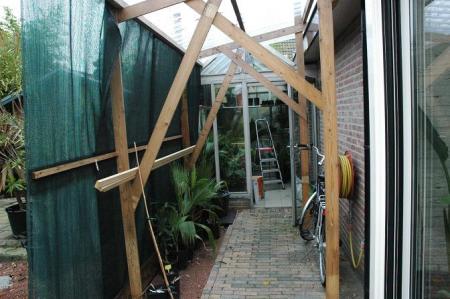 Dit keer de kas verlengd met een afdak tegen de muur. Hier komen straks die planten onder die toch wel wat vorst kunnen verdragen maar die ik liever niet laat bevriezen als de winter doorzet.