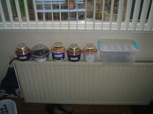 En om te kiemen heb ik ze gewoon binnen op de verwarming gezet met schaaltjes erop om te laten broeien, dit is erg goed uitgepakt bij mij! Hieronder een foto van toen...