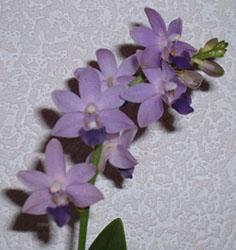 Dit is geen Phalaenopsis (al wordt hij wel eens onder die naam aangeboden) maar een Doritaenopsis Kenneth Schubert . Het is een kruising van Doritus pulcherrima x Phalaenopsis violacea. Wordt regelmatig aangeboden, momenteel bij v. Brummelen in Twello. Meer lila dan blauw maar door hem blauw te noemen verkoopt het beter. Daarom wordt elke bloem die een vaal afwaswaterkleurtje heeft al gauw onder de noemer blauw aangeboden.