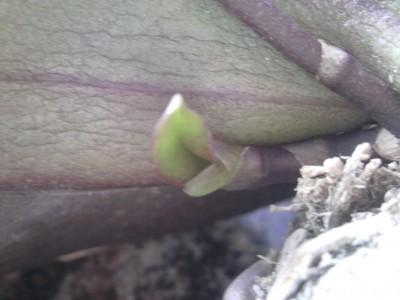 er groeit bij e1 van mijn mini phaleonopsissen een naar wat ik eerst dacht bloeistengel van nu ongeveer anderhalve cm,maar aan het uiteinde groeit er een mini blaadje.