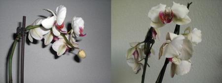 Ik heb een paar weken geleden een Phalaenopsis gekocht bij intratuin. Hij heeft 3 stengels met prachtige witte bloemen met een donker roze/paars hart. (de bloemen hadden toen al een wat gelige gloed op de buitenkant van de bladeren. Ik heb absoluut geen verstand van deze prachtige bloemen maar wilde al zo lang eentje hebben dat ik de mooiste eruit heb gezocht, niet wetende dat er heel wat meer komt kijken bij het aanschaffen van een orchidee..