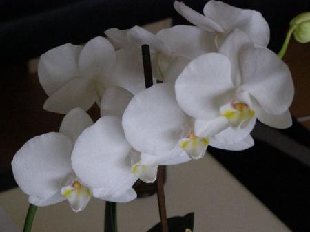 Als je hem in de gang hebt staan, krijgt hij dan wel genoeg licht? Daar heeft hij wel behoefte aan. Ik kan je verder geen raad geven. Mijn ervaring is dat je soms van alles en nog wat probeert maar dat de orchidee toch gewoon zijn eigen gang gaat. Hij laat je gewoon een jaartje wachten en dan het volgende jaar staat hij ineens te bloeien. Niet een keer maar twee of drie keer per jaar.