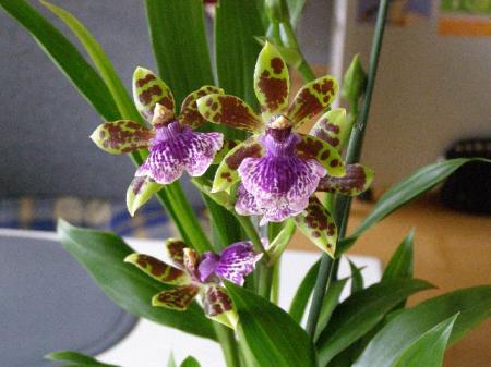 Ik weet(enfin zo had ik het ergens gelezen)dat het koeler moet staan dan een phalaenopsis....en niet in de zon.....dus staat hij bij mij in de gang(juist plaats voor 2 orchids te zetten) waar het altijd een beetje frisser is dan in huis,alsook zou ze meer water vereisen....gezond is ze wel....mooi gevulde pulpen....mooi groen blad en maak steeds nieuwe scheuten(behalve haar bloei)