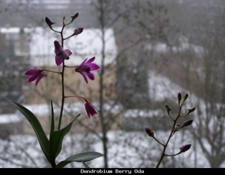 Over een Dendrobium Berry oda met een heleboel keiki's heb ik al eens eerder een foto laten zien. Nu bloeit hij weer, waarvan een paar foto's. Achter het raam een sneeuw landschap.