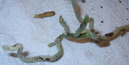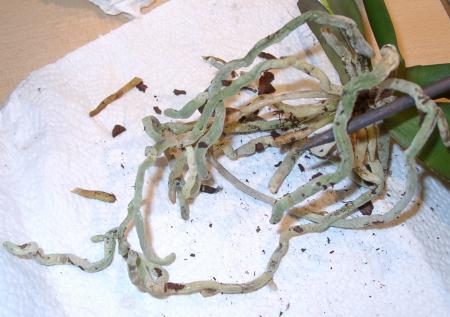 Ik had een keer een orchidee bij de praxis gekocht, die veel te nat was. Ik had hem helemaal mooi gekregen, maar nu merkte ik net dat er schimmel op een aantal wortels zit. Hij is blijkbaar dus toch weer te nat geworden (terwijl de andere 2 het prima doen).