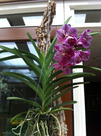 Vanda nummer twee is sinds een week of twee in bloei. In totaal acht bloemen aan de tak; alleen de laatste knop is ingedroogd. Ik geniet met volle teugen!