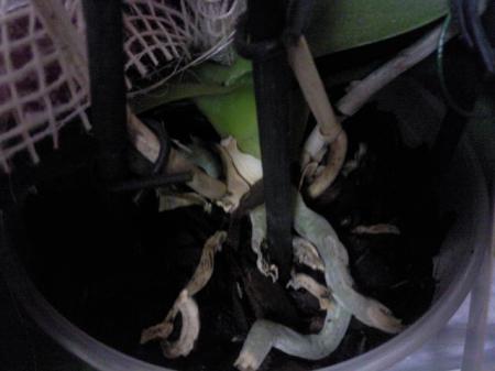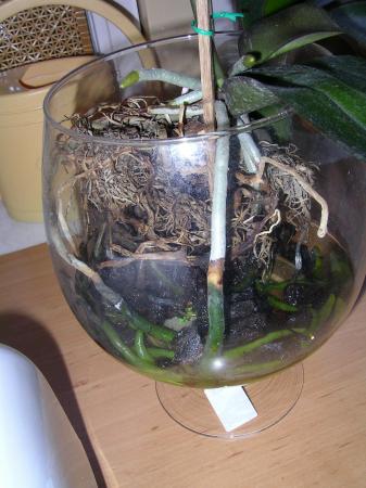 ps. op de foto heb ik een ten dode opgeschreven orgidee in een glas met grote kiezelstenen geplaatst, en hij doet het weer. Het water komt niet boven de kiezels uit. kijk maar eens naar de krachtige gezonde wortels.