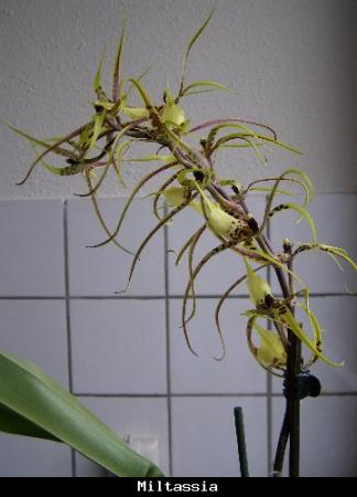 Nog een paar foto's erbij voor het mooie. De Vanda Ascda Gold is al weer voor de tweede keer dit jaar gaan bloeien. Verder nog een Miltassia die weer is gaan bloeien en heerlijk ruikt. Die heb ik vorig jaar op de NOV-dag in Utrecht gekocht. Met de Miltonia's wil het niet erg lukken.Knoppen worden bruin.Waarschijnlijk toch eerder te veel water gegeven. Nu komt er een bloemstengel aan de Dendrobium Bigibbum var.. Hoe kan ik die nu het beste water geven, gewoon een keer per week dompelen of is dat te veel? Die wil ik toch wel goed verzorgen, want daar komen mooie bloemen aan.
