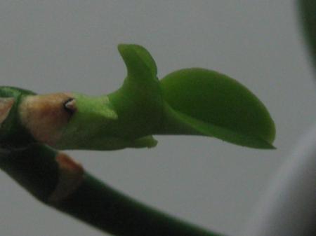 Na twee maanden geen groeibeweging en dan de 22 juni even een tiental foto's in close up met blits moeten nemen om één goede te hebben....om dan eens mijn vraag te stellen...en nu beslist die orchidee weer in actie te schieten...eureka....het groeit en men ziet eindelijk wat het is,het begin van een blad...