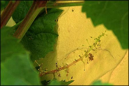 Ook een Druif, Frakenthaler , daar blijven de grote bladeren wel mooi groen, maar de vele kleine trosjes met ( druiven of Bloemen ?)die zich vormen, vallen na een tijd gewoon uit elkaan, en er blijft niets van over... daar heb ik ook een verduidelijkende foto van gemaakt, want dat vind ik bijzonder jammer.