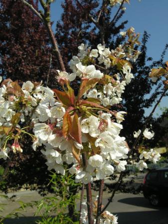 Deze geënte kers op hoogstam had ik aangeschaft voor de fraaie witte bloesem. Nu hangt er welgeteld 1 kers in (dat wordt loten), zodat ik me realiseer een vruchtboom in plaats van een sierkers Prunus cerifera te hebben gekocht.