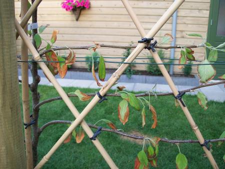 Wij hebben zo`n maand geleden 3 fruitbomen gekocht: een kers, een pruim en een appelboom. De kers en de pruim zie je bijna per week groeien. Maar de appelboom doet het niet echt goed. Zoals je op de foto kunt zien, worden de blaadjes bruin en vallen af. Ook is hij nog geen cm gegroeid. In het begin dachten we dat hij gewoon een klap had gekregen van het planten, maar we zien het erg somber in. Kan iemand ons raad geven om de boom te redden. Hij krijgt genoeg water en voeding.