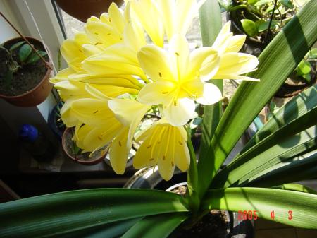Bij deze cv. citrina is het niet eenvoudig om een mooie plant te selecteren. Het gros van de planten heeft veel langere en dunnere bladeren en fletse bloemen. Maar af en toe komt er een plant voor die volledig de groeiwijze heeft van een gewone oranje Clivia en ook met intens gele bloemen. Dat zijn hele mooie planten en als je zo'n zaailing hebt, koester hem dan.