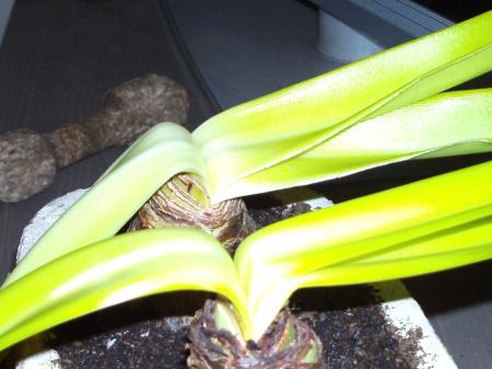 Als je een Amaryllis oppot dan zet je hem in het licht en geeft geen water. Als er een puntje zichtbaar wordt dan geef je de plant een drupje water. Na een week weer een drupje zo doorgaan tot de bloemknop een handbreedte boven staat dan ga je iets meer en wat vaker water geven....... Dan zal je zien dat er ook een beetje blad gaat komen......