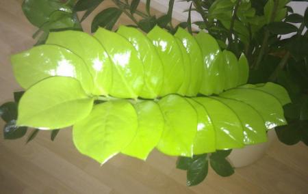 De zamioculcas zamiifolia noemt men ook wel kamerpalm. Ze oogt exotisch met