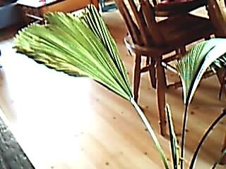Hij heeft stekelige stengels en waaier~vormige, groene bladeren.