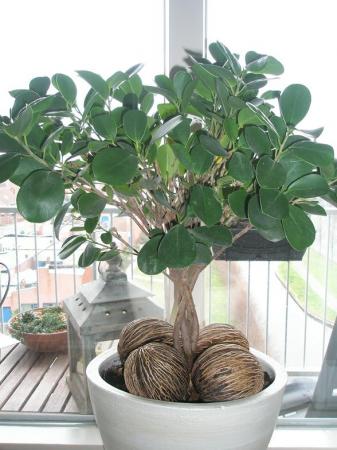 Dit is Ficus 'Panda'.De zaaddozen die er onder liggen, hebben niets met deze plant te maken en zijn louter versiering.