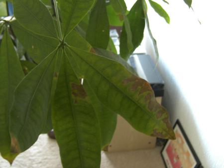 de eerste foto is van een plant waar de bladeren van binnenuit zeg maar bruine plekken gaan vertonen, dit gebeurt vooral op de wat oudere grotere bladeren, hoe kan dit? of wat is dit? wat is hier tegen te doen?
