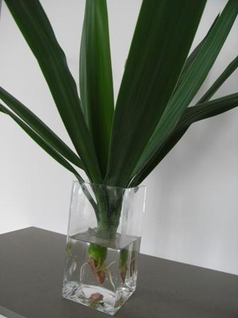 We hebben de mooie volle top bewaard met een stam van zo'n vijf cm lang. De stam hebben we rondom wat afgesneden en op water gezet.