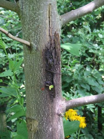Het is moeilijk om de oorzaak van die barst te geven, dat zou een vorstscheur kunnen zijn, dat kan het gevolg zijn van wortelschade of misschien zonnebrand.