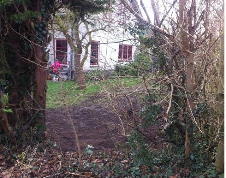 een gat naast een bestaande haag. Er is door het recent opruimen van een