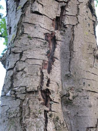 is er de laatste jaren iets gewijzigd rondo of onder de boom? Bij een boom van die grootte zou je normaal al een beetje de wortelaanzetten moeten kunnen zien. Is de grond rondom de boom bewerkt of opgehoogd?