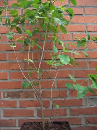 Als je hier een boompje van wil maken kies je een tak die redelijk recht omhoog gaat en dit wordt dan de stam. Zet er een bamboestok bij en bind de tak aan met bindbuis. De bamboestok is echt noodzakelijk. De overige takken snoei je weg. Probleem is dat de slapende knoppen hierop reageren door uit te gaan lopen. Als ze dit gaan doen direct wegwrijven of wegknippen en dit consequent blijven volhouden.