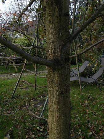 Welke boom is dit? een Eikenboom? maar er zijn nog nooit eikeltjes gesignaleerd volgens de eigenaar. Zou een ''traumaatje'' zijn als dit niet zo is, want hij heeft als klein jongetje ooit een ''eikeltje'' ? in de grond gestopt, zegt hij.