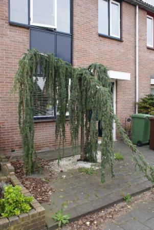 libani 'Glauca Pendula' , een treurceder. Er valt weinig toonbaar te maken aan deze boom; dit is de groeiwijze. Alleen staat ie op een beroerde plek, waar geen ruimte is om uit te groeien.