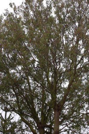 Tja, hij ziet er nog steeds zielig uit al heb ik het idee dat hij/zij een beetje aan het herstellen is. Er komen aan alle kanten nieuwe takjes en blaadjes aan en de kruin wordt een beetje minder doorzichtig. Maar er zitten veel dode takken en takjes. Die ga ik er in het najaar uithalen, voor zover ik er bij kan en dan maar hopen. Er valt nu geregeld water uit de hemel dus dat kan ook bijdragen. Wel is het zo dat ik ergens gelezen heb dat dit soort boom niet echt oud wordt. Ik laat hem toch nog staan want slopen kan altijd nog.