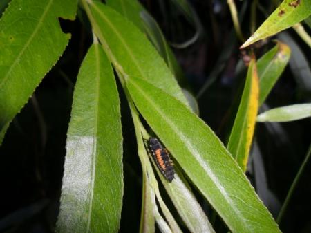Dag iedereen,ik ben al dagen aan het speuren onder mijn treurwilg naar wat er allemaal van beestjes inzitten,mieren op de stam(elk jaar)dan een wit schuim met kevertje erin de schuimcicade denk ik,nu groene en zwarte bladluizen ontdekt,piepkleine groene mini rupsjes op een kapot gegegeten blad,het blauwe wilgenhaantje,nog maar 2 lievenheersbeestjes gezien,en dan de zwarte diertjes (waar ik uitleg over vroeg bij mijn eerste foto),maar die beestjes zijn denk ik wel de larven van het lievenheersbeestje,ik heb juist een nieuwe foto getrokken en hier zie je duidelijk een oranje-rode kleur in.Ik heb besloten om zondag de boom te bespuiten met gewoon koud water(voor de bladluizen)mijn man wil vergif spuiten maar dat wil ik niet omdat ik de larven van het lhb niet wil doden .Groeten allemaal