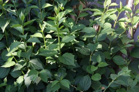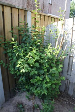 Sinds een aantal maanden ben ik verhuisd en heb ik deze struik in mijn tuin staan. Wie weet hoe deze struik heet? Hij groeit echt razendsnel, ik denk wel een meter per maand. De jonge stengels groeien uit tot dikke stokken.