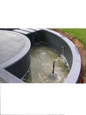 Wij hebben een strakke vijver van ongeveer 17.000 liter nieuw gemetselt en laten polyesteren. De vijver is 1,20 meter diep.