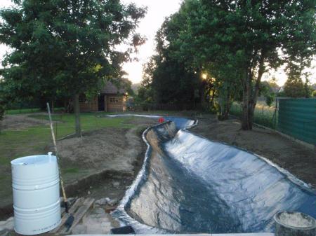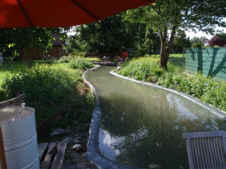 Zoals je ziet is die bij ons ook een vrije vorm, kronkelige rivier met aan beide uiteinden een druppelvorm, achteraan voor de moeraszone, lengte ongeveer een 30 meter.