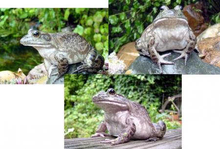Ik heb de groene en bruine kikkers ook, alsook een pad of twee.... en sinds een week hebben we er nog een pad bij, mijn buurvrouw vond hem in haar gesloten compostemmer,nu mag hij gezellig in ons tuintje vertoeven :-) overals waar men in de tuin loopt , komt men de kikkers tegen of lopen ze gewoon voor je voeten....het krioelt ook volop van de kikkervisjes.... even een foto van de vondeling(pad).... groetjes, kikketje