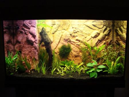 De roze gloed komt van een tl-buis die aanbevolen werd door de dealer, goed voor vis en plant en tegen alg.( met uv-stop?).