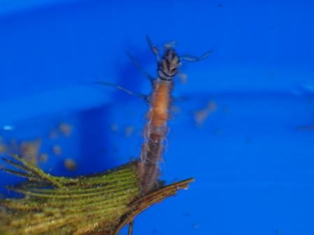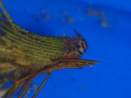 Ik heb enkele van deze plantjes uit de vijver gehaald om nader te inspecteren. Het duurde even om te zien dat een klein beestje zich in de holle binnenkant van de plant had genesteld. Dit beestje sleurde zijn 'huisje' heel de tijd achter zich mee.
