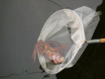 Dubbelpech voor die vis, ook nog in een netje en boven water. Kikkers/padden grijpen soms alles wat groter is dan zichzelf, om mee te paren.