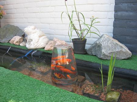 Dus Zo'n vissen kommetje op je vijver ziet er wel leuk uit, maar is niet leuk voor je vissen, ik vind het er trouwens niet uit zien, lijkt net of je een observatorium op je vijver hebt!.