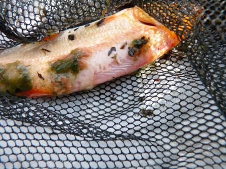 Poosje geleden zag ik in mijn vijver een goudwinde die deels bedekt was met een groene waas(zie foto's),leek op algengroei wat het zeker niet was. Geprobeerd de vis eruit te vangen maar was nog veel te levendig. Zodra je je bij de vijver vertoonde verdween ie uit het zicht.